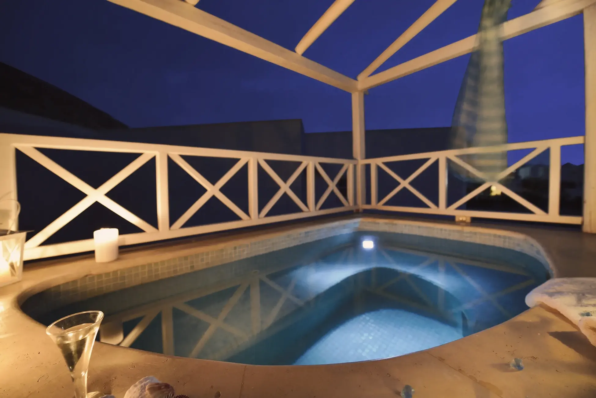A charming interior staircase connects the two levels, leading to the highlight of the suite: a spacious private veranda overlooking the stunning landscaped pool area. Here, you can unwind in your outdoor jacuzzi, enjoying the ultimate relaxation experience in a luxurious, serene setting.