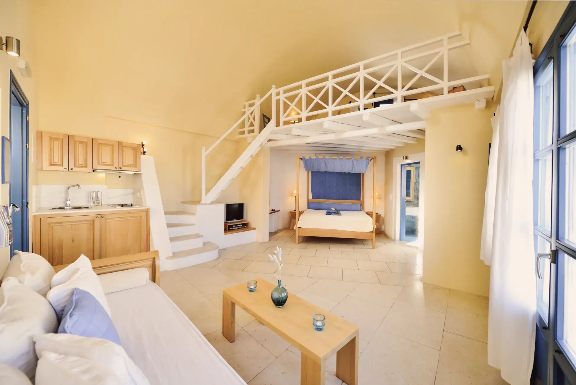 The lower major level comprises the main bedroom, living area, kitchen and bathroom. On the loft, made of wood and with a domed ceiling in the traditional manner of the island, there are 2 single beds and space for a third one if required.